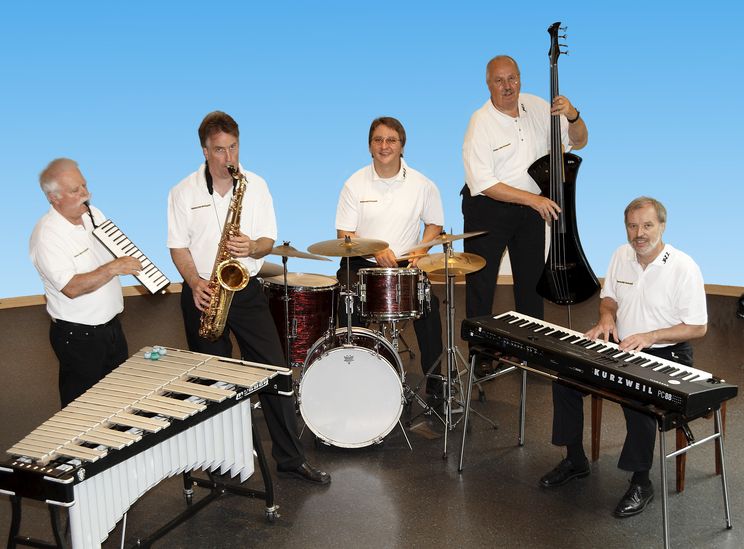 mit Schlagzeug, Bass, Piano sowie Vibrafon und Saxofon gibt dem Quintett